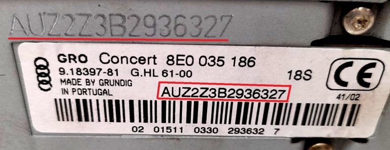 Het serienummer van uw Audi autoradio staat op een sticker aan de zijkant van de radio. Het begint met AUZ.